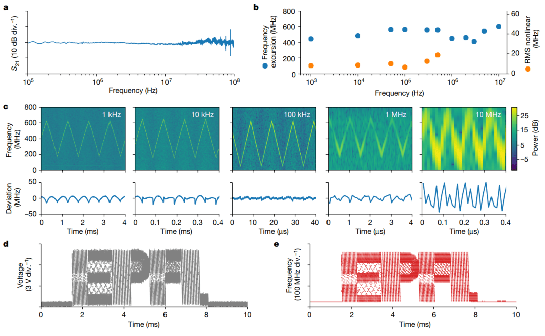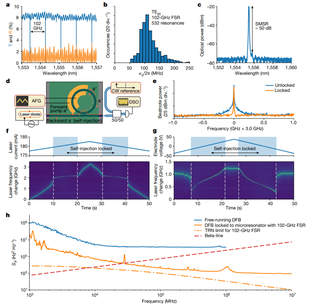 為了制造激光器,該團隊在EPFL制造了基于氮化硅的光子集成電路,然后在IBM將其與鈮酸鋰晶圓結(jié)合。該平臺基于超低損耗Si3N4光子集成電路與薄膜LiNbO3的異質(zhì)集成,通過在晶片級直接鍵合,與之前演示的芯片級集成不同,具有8.5B/m的低傳播損耗。通過自注入鎖定到激光二極管,實現(xiàn)了窄線寬激光(固有線寬為3千赫茲)。諧振腔的混合模式允許其以12 PHz/s 的速度進(jìn)行電光激光頻率調(diào)諧,其在高線性度和低遲滯的同時,可保持窄線寬。