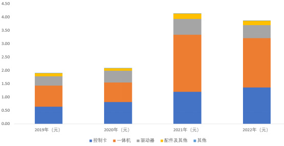 維宏股份——目前收入構(gòu)成中,一體機、控制器、驅(qū)動器、配件及其他、其他,分別占比47.76%、35.14%、12.51%、4.41%、0.18%。其中,一體機集成了運動控制卡、 CPU 主板、顯示器(液晶屏)、專業(yè)操作面板等;控制器是數(shù)控軟件的底層控制算法的載體以及硬件接口。