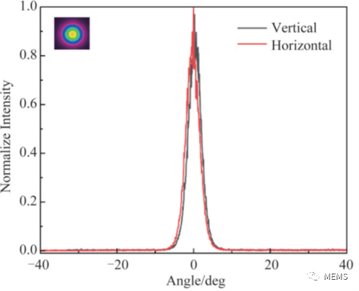 在-10℃溫度下VECSEL在泵浦功率為5 W時(shí)的輸出遠(yuǎn)場(chǎng)分布,插圖為輸出光斑二維彩圖