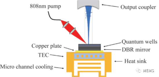 這項(xiàng)研究提出的VECSEL系統(tǒng)由泵浦激光、熱沉及控溫TEC、增益芯片和輸出耦合鏡組成。增益芯片發(fā)光區(qū)由兩組不同發(fā)光波長(zhǎng)的量子阱組成,其中一組發(fā)光波長(zhǎng)較短的量子阱采用吸收區(qū)泵浦的方式,另一組發(fā)光波長(zhǎng)較長(zhǎng)的量子阱采用阱內(nèi)泵浦方式。VECSEL工作時(shí),增益芯片底部的熱沉溫度通過(guò)半導(dǎo)體制冷片TEC控制。