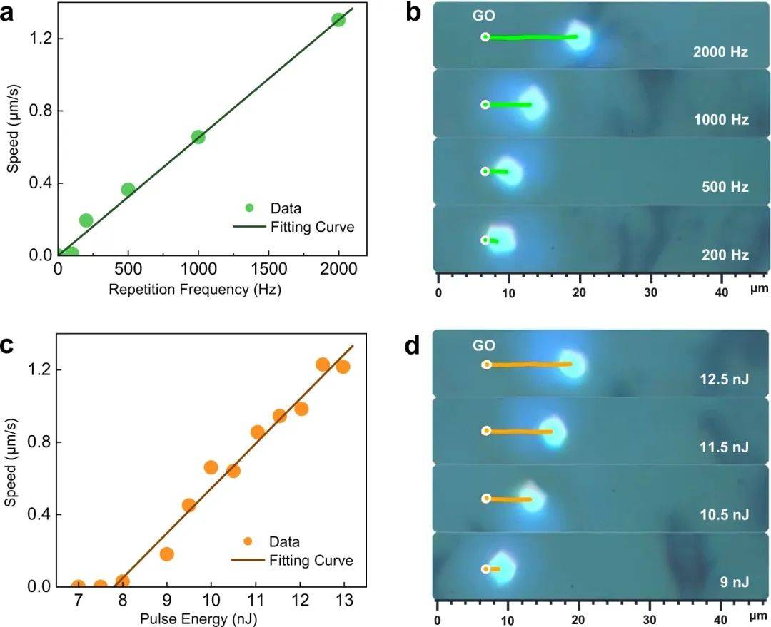 為了進(jìn)一步評估運(yùn)動的影響,研究人員確定了VSe2納米片的速度。圖2a顯示了在脈沖能量固定的情況下,行進(jìn)速度作為重復(fù)頻率的函數(shù)。速度隨重復(fù)頻率呈線性增長,說明每個激光脈沖都可以驅(qū)動納米片移動一定距離(圖2b),并且每個脈沖誘導(dǎo)的移動是相互獨(dú)立的。圖2c顯示了速度與激光脈沖能量之間的關(guān)系。它隨激光能量線性增加(圖2d),特別是具有階梯狀閾值。