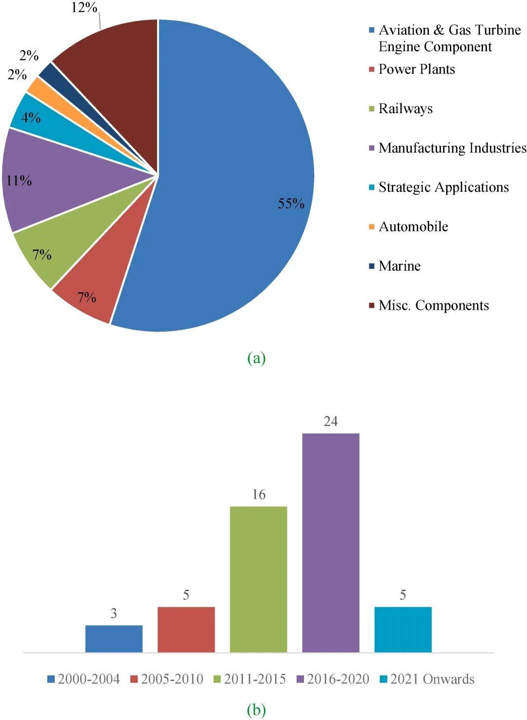 圖5 激光再制造在不同領(lǐng)域中應(yīng)用的占比和激光再制造的文獻(xiàn)數(shù)量