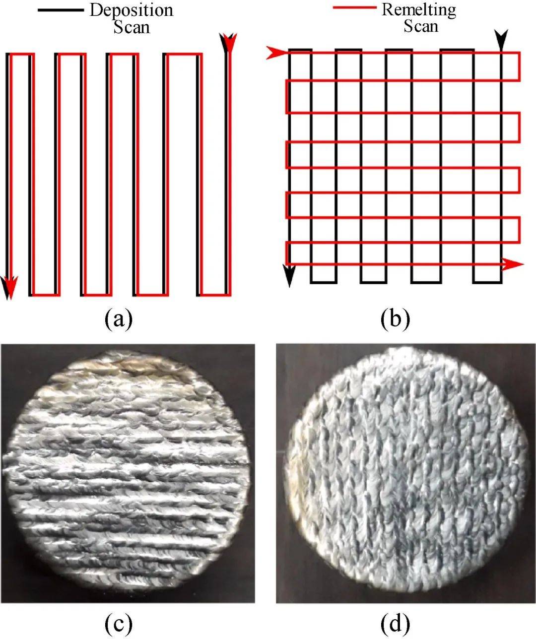 圖16 補(bǔ)救措施: (a) 沿著掃描道次進(jìn)行重復(fù); (b) 垂直于掃描道次重熔;重熔后的表面:(c) 沿著掃描道次重熔;Along the clad track, and (d)垂直于掃描道次重熔 。(基材直徑: 28 mm, 基材高度: 10 mm)