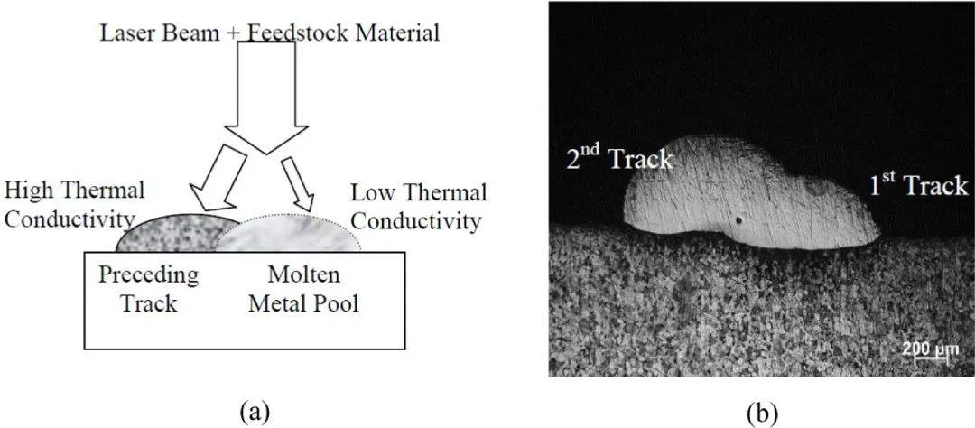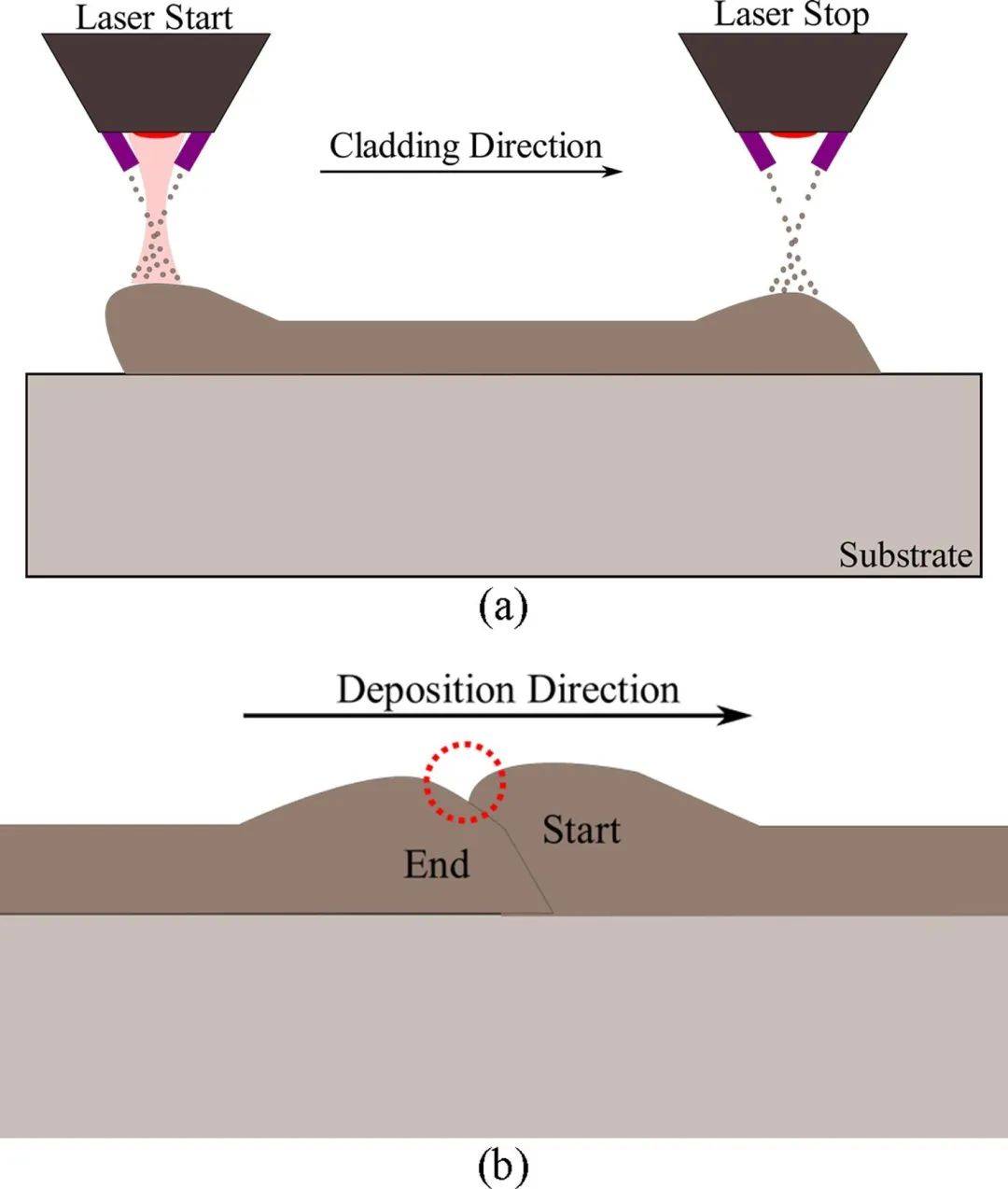 圖9 激光沉積的開始和停止時(shí)的缺陷: (a) 過沉積Over-building, and (b) 在閉合的熔覆道上開始和結(jié)束時(shí)的 不匹配的熔覆道的橫截面