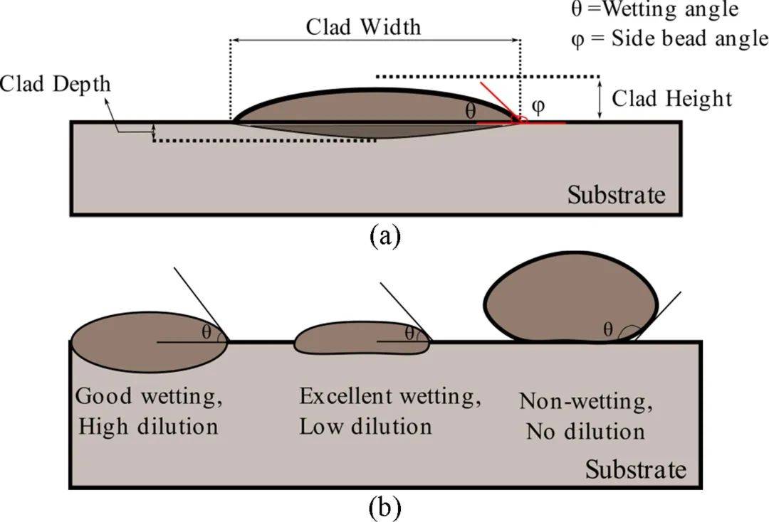 圖10 (a) 定義激光熔覆層的橫截面時(shí)的形狀參數(shù);(b) 基于稀釋率的不同的潤濕性