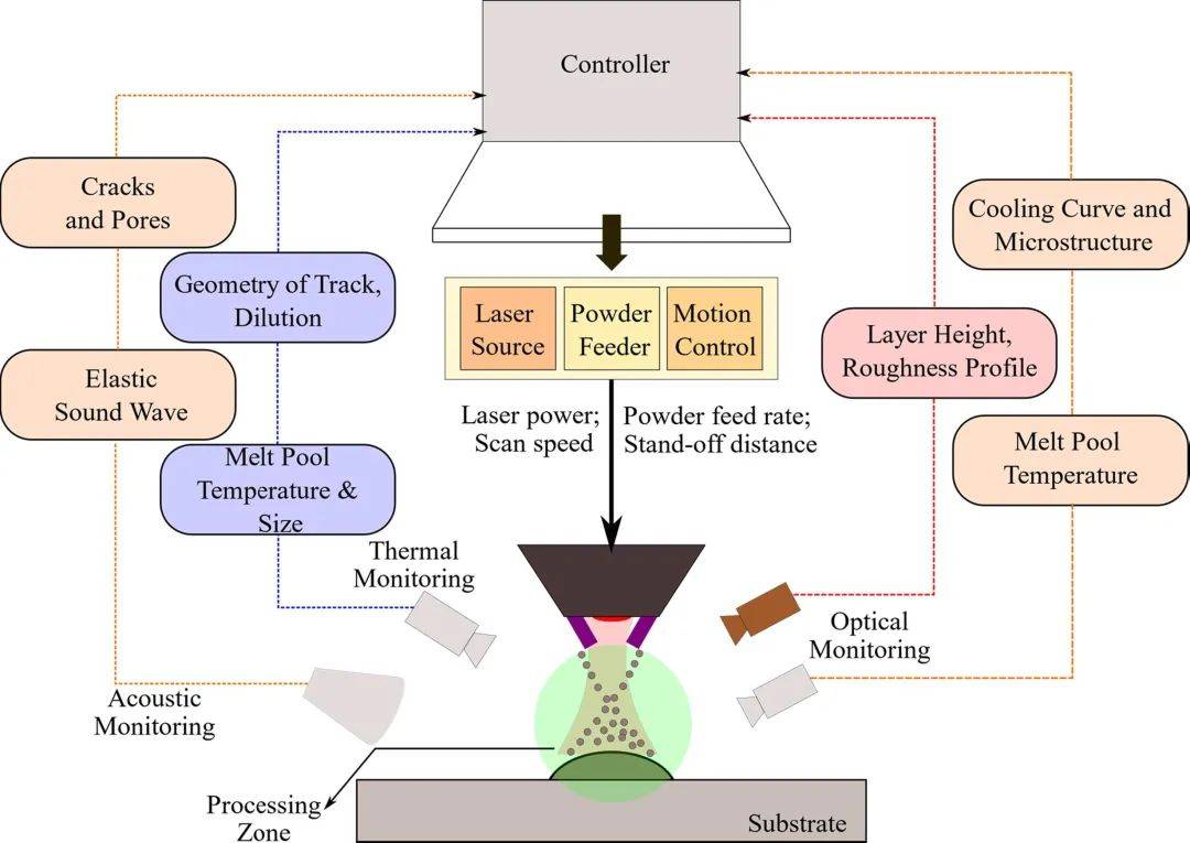 光學(xué)監(jiān)控技術(shù)主要用來控制粉末的流量、稀釋率、匙孔現(xiàn)象、熔池的形狀和成分、熱和冷裂紋、層間的搭接、沉積層的形態(tài)變化等。工藝信號(hào)通過光電二極管、高速相機(jī)等捕獲。同時(shí)還可以利用照相和不同的過濾器以減少對(duì)比度和過濾額外的噪音。此外,激光位移傳感器、光學(xué)發(fā)射光譜和激光多普勒振動(dòng)儀也可以用來進(jìn)行監(jiān)測。