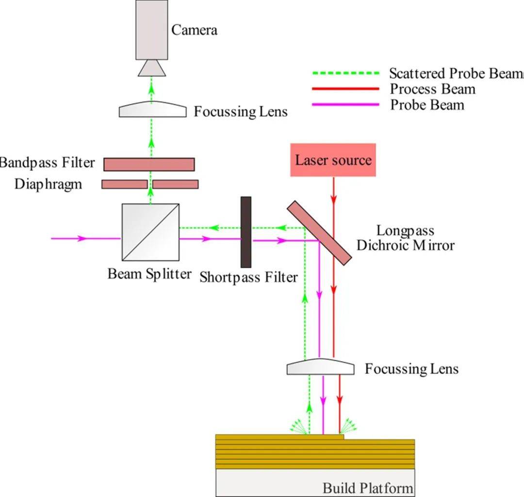CCD(充電耦合裝置)和互補(bǔ)金屬氧化半導(dǎo)體(CMOS)相機(jī)是兩種不同類型的用于監(jiān)控的相機(jī)。對(duì)CCD相機(jī),信號(hào)為像素,通過剪切或相機(jī)中的單個(gè)電流來獲取,然而,在CMOS相機(jī)中,每一像素都有自己的處理電流,從而提高了即使是很復(fù)雜時(shí)也可以快速處理。探頭可以同軸,也可以旁軸或者離軸安裝。同軸設(shè)備可以對(duì)整個(gè)熔池實(shí)時(shí)監(jiān)控,而側(cè)軸可以對(duì)整個(gè)區(qū)域進(jìn)行處理,并且不會(huì)受到激光頭振動(dòng)的影響。在同軸探測的時(shí)候,激光加工的光學(xué)路徑可以如圖18所示。這一系統(tǒng)有一個(gè)光束過濾器。濾波器和分光鏡。