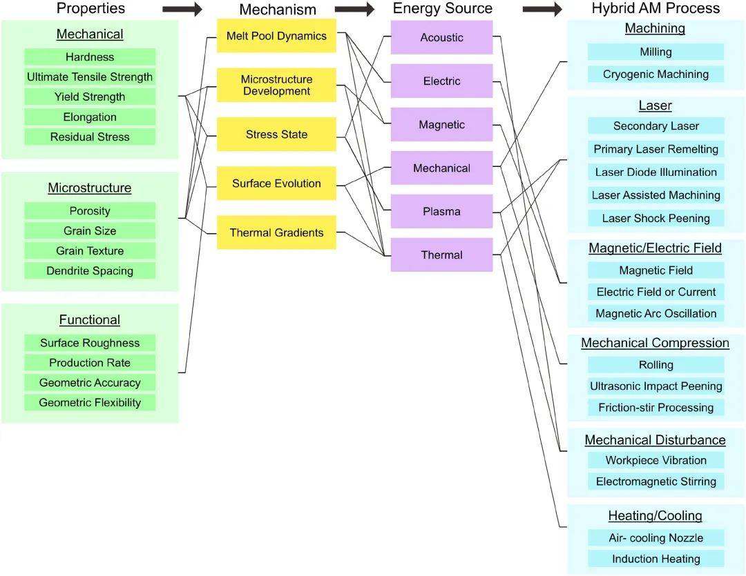 圖17-2 復(fù)合增材制造的時(shí)候,從機(jī)理和能量源的角度出發(fā)得到的性能-機(jī)理-能量源-復(fù)合工藝的流程圖