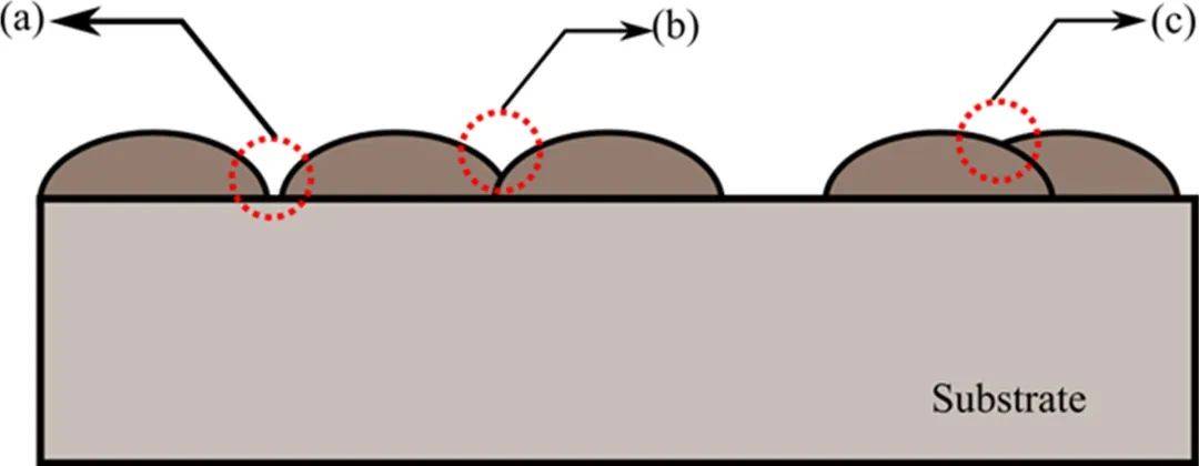 基材的表面粗糙度以及由于沉積所造成的粗糙度也會(huì)影響到沉積質(zhì)量。Ibrahim等人的研究表明,單層熔覆FeCrMoCB非晶粉末到不含Ni的不銹鋼上的時(shí)候,熔覆道的寬度、高度均隨著基材表面粗糙度的下降而增加。粉末的顆粒大小也會(huì)影響到表面粗糙度。經(jīng)常來說,熔覆時(shí)的表面均不會(huì)太光滑。沉積層的表面粗糙度顯著的受到粉末質(zhì)量、掃描速度和搭接率的影響。激光沉積后,如果表面太粗糙就需要進(jìn)行后續(xù)的機(jī)加工以獲得好的表面質(zhì)量,表面粗糙時(shí)不僅會(huì)影響到表面質(zhì)量,也會(huì)影響到氣孔的形成??刂拼罱勇剩ㄒ妶D11)是一個(gè)比較關(guān)鍵的因素,這是因?yàn)槎嗟罀呙璨拍芨采w一個(gè)比光斑還大的面積。兩道搭接時(shí)一般搭接率在29-50%。進(jìn)一步的,粉末也會(huì)影響到沉積層的表面質(zhì)量,粗顆粒的粉末會(huì)造成粗糙的表面。此外,LMD工藝得到的表面是比較差的,在隨后的沉積層很有可能形成氣孔。表面粗糙度增加有可能造成空隙。相似地,Thijs等人的研究就提到過,長的氣孔就是由于表面粗糙度的原因而形成的。