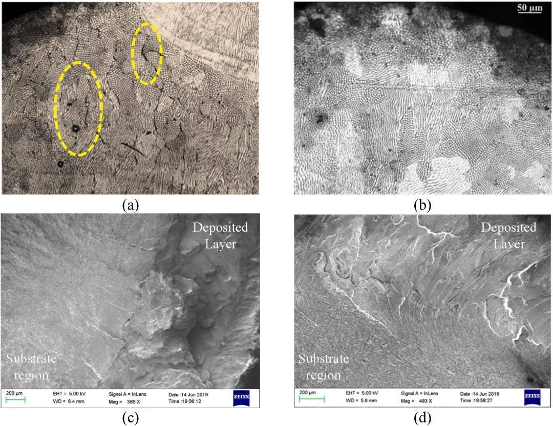 圖14 通過重熔消除裂紋: (a) 沒有重熔的情況;(b) 對(duì)沉積層進(jìn)行重熔(熔覆層: Ni-5Mo-5Al, 基材: AISI 1020);疲勞后 斷裂后的界面: (c) 沒有重熔的結(jié)果;(d) 重熔后的結(jié)果 (熔覆材料: Inconel 625, 基材: AISI 1020)