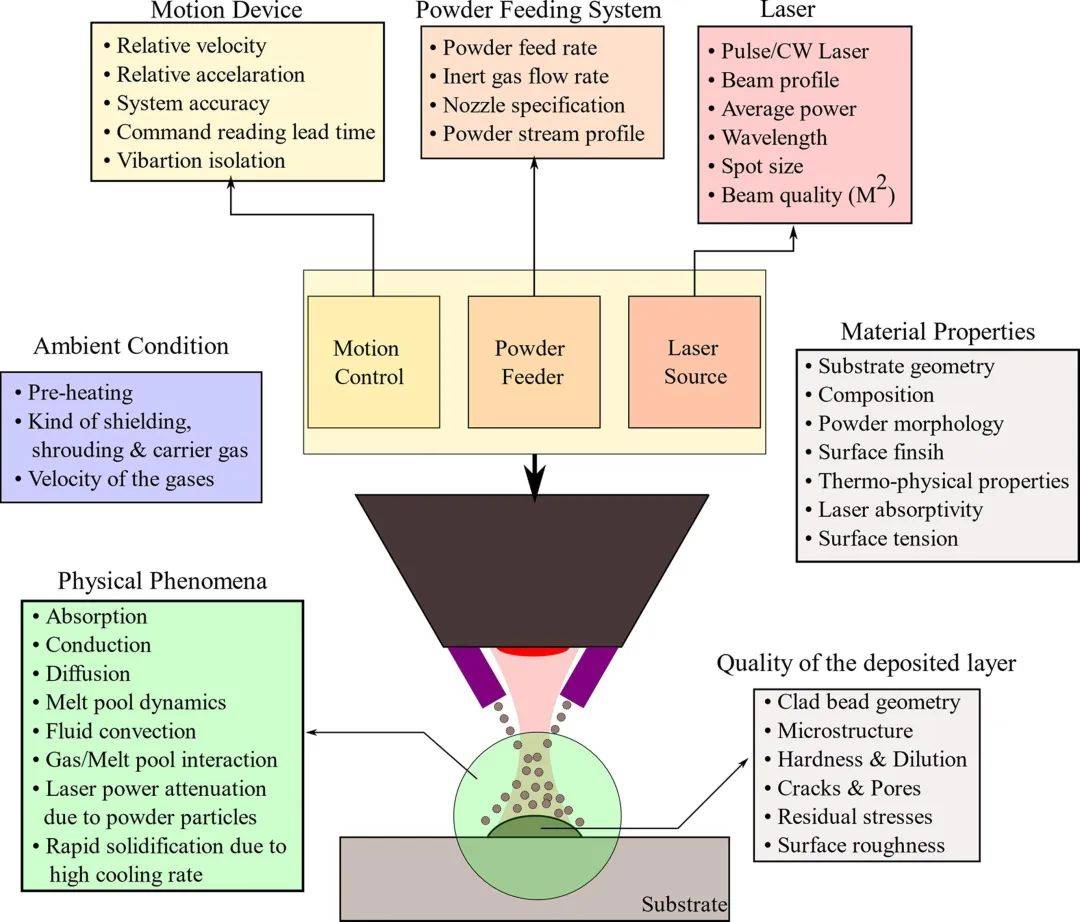 由于激光再制造工藝包括大量的工藝參數(shù)和復(fù)雜的熱循環(huán),甚至是工藝過程中的一個(gè)小的變化都會(huì)帶來熔覆質(zhì)量、缺陷和精度的變化。而且,單獨(dú)的缺陷累積會(huì)影響到最終的部件。仔細(xì)的研究激光沉積工藝過程,可以看到它包括非常復(fù)雜的物理過程{見圖6-1}。同時(shí)還存在一些同系統(tǒng)相關(guān)的參數(shù),則這些參數(shù)同工藝參數(shù)一起使得整個(gè)過程變得更為復(fù)雜。而且,熔覆尺寸、表面質(zhì)量(粗糙度)、稀釋率、機(jī)械性能和顯微組織等均會(huì)由于一個(gè)小小的變化而受到極大的影響。不同的系統(tǒng)參數(shù)、粉末性能、基材、粉末的噴射時(shí)的物理現(xiàn)象以及沉積層的不同特征見圖6。