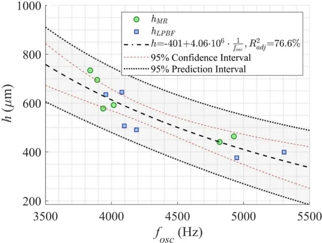 熔池的深度也是一個(gè)非常重要的參數(shù),會(huì)影響到稀釋率和匙孔的生成,額外的稀釋率對(duì)沉積層的形狀和質(zhì)量具有較大的影響。熔池深度直接同激光功率相關(guān),并且反過來正比于掃描速度??刂迫鄢厣疃葧?huì)造成層之間同基材具有較大的結(jié)合力。監(jiān)控熔池的波動(dòng)可以用來控制熔池的深度。Caprio等人展示了熔池深度和單道沉積時(shí)的振動(dòng)頻率之間的關(guān)系,見圖19。他們測量了熔池表面的振動(dòng),借助一個(gè)高速CMOS相機(jī)捕獲二次探測的反射光束來實(shí)現(xiàn)的。進(jìn)一步的,他們的研究結(jié)果表明所用相機(jī)的識(shí)別頻率至少是振動(dòng)頻率的二倍。