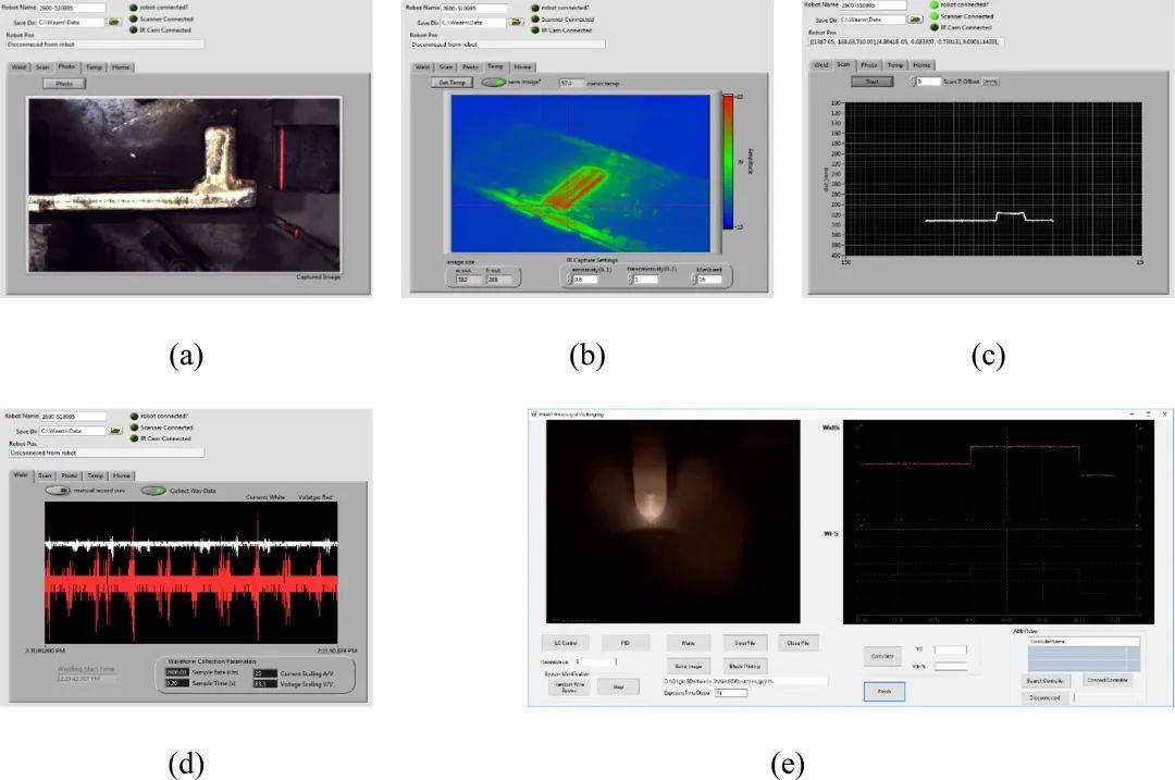 圖17-2 不同傳感器的控制監(jiān)測軟件的界面圖: (a) 相機(jī)Camera ;(b) 熱成像相機(jī)Thermal camera ;(c) 激光掃描(Laser scanner);(d) 電力傳感器electrical sensors;(e)熔池視覺傳感器 Melt pool vision sensor。