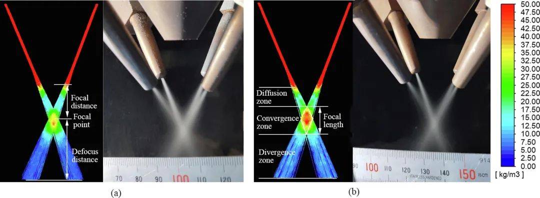 圖4-1 (a) TC4 粉末和; (b) 304L粉末時(shí)采用四個(gè)送粉嘴進(jìn)行實(shí)驗(yàn)和模擬的結(jié)果