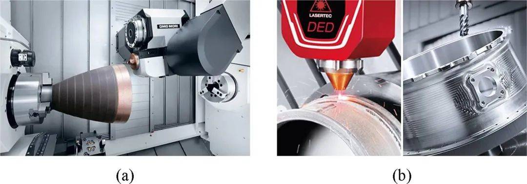為了最大限度的發(fā)揮多種工藝的優(yōu)勢,激光沉積工藝可以同其他工藝或其他能量源一起。比較典型的,不同的后處理工藝,如機(jī)加工、噴丸、熱處理、冷/熱等靜壓。攪拌摩擦焊等均可以用來解決諸如形狀精度、表面粗糙度、表面裂紋、殘余應(yīng)力、氣孔等問題。然而,復(fù)雜形狀部件的機(jī)加工或內(nèi)部形狀的加工是比較困難的,這是因?yàn)槲锢砜臻g的限制、收縮和包裹等。為了解決上述問題,可以引入另外一種工藝來解決,而不是事后解決。目前商業(yè)上的激光增材復(fù)合制造的一個(gè)典型案例就是DMG的增減材復(fù)合制造,見圖13。