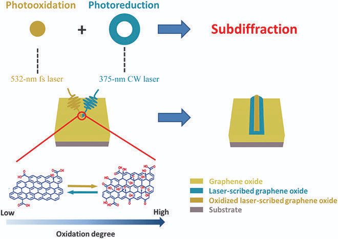 石墨烯的激光直寫圖案化被廣泛應(yīng)用于光電子器件領(lǐng)域,可以有效提升器件的性能。傳統(tǒng)的石墨烯圖案直寫通常利用單光束光刻驅(qū)動氧化石墨烯的光還原,從而形成石墨烯圖案。但由于光學(xué)衍射極限的限制,目前所報道的激光直寫石墨烯圖案的線寬大都在微米量級,制作超越衍射極限尺度的激光直寫石墨烯圖案是光刻領(lǐng)域的一個巨大的挑戰(zhàn)。