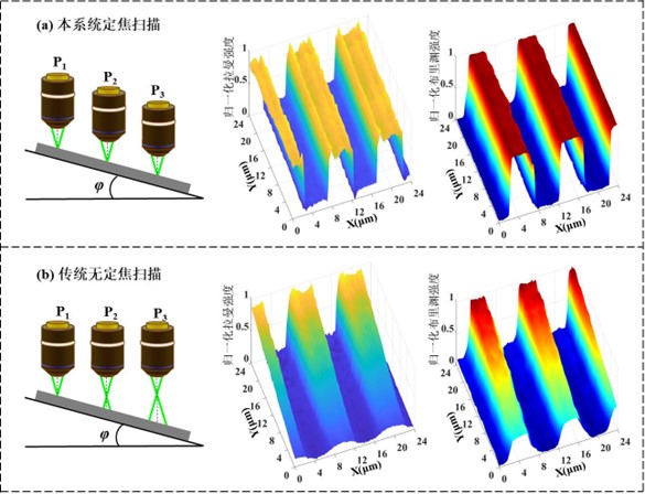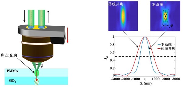 (a) 斜向激發(fā)與收集光路   (b) 壓縮了散射體軸向尺寸