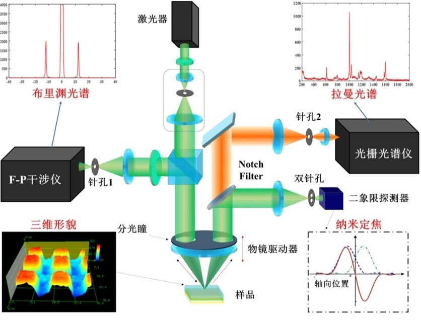 鑒于此,該團(tuán)隊(duì)在國(guó)家自然基金重點(diǎn)項(xiàng)目“機(jī)械形態(tài)性能激光分光瞳差動(dòng)共焦布里淵—拉曼光譜測(cè)量原理與傳感系統(tǒng)(51535002)”等項(xiàng)目支持下,發(fā)明了圖1所示的高穩(wěn)定、高分辨、抗散射分光瞳激光差動(dòng)共焦拉曼-布里淵(Divided-aperture Laser Differential Confocal Raman-Brillouin,DLDCRB)圖譜成像新方法(授權(quán)中國(guó)發(fā)明專利ZL 201410086366.5和歐洲發(fā)明專利EP 3118608 B1),該方法將分光瞳激光差動(dòng)共焦顯微技術(shù)與拉曼光譜和布里淵光譜探測(cè)技術(shù)相結(jié)合,通過差動(dòng)共焦測(cè)量技術(shù)進(jìn)行納米精度的樣品定焦,來提高系統(tǒng)空間分辨力和穩(wěn)定性;通過分光瞳斜向激發(fā)與探測(cè)技術(shù)進(jìn)行反射光和層間散射光等干擾光的抑制,來提高系統(tǒng)的光譜探測(cè)信噪比;通過拉曼光譜與布里淵光譜的同源激光激發(fā)與高分辨分離探測(cè),來實(shí)現(xiàn)微區(qū)幾何形貌、拉曼光譜和布里淵光譜的高穩(wěn)定、高分辨原位圖譜成像。