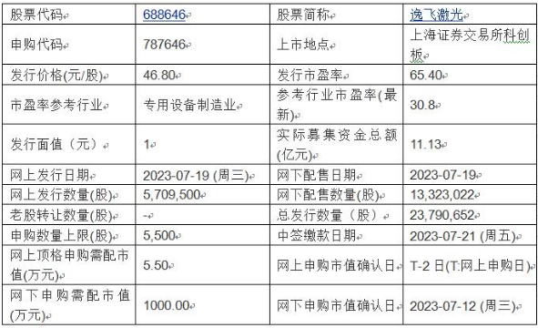 今日,逸飛激光(688646.SH)開啟上交所科創(chuàng)板申購,發(fā)行價(jià)格為46.80元/股,申購上限為0.55萬股,市盈率65.40倍。