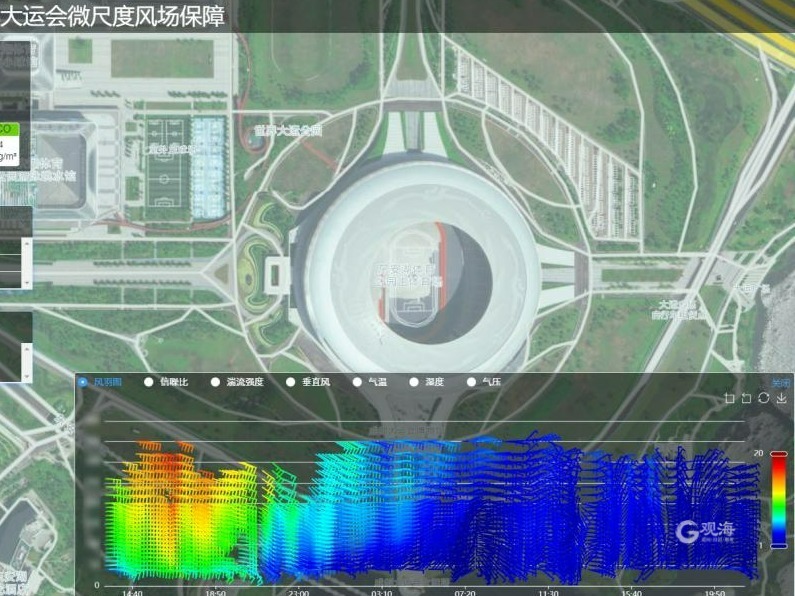 “點燃主火炬時需要知道場內(nèi)風(fēng)速的大小。”“我們非常關(guān)注冠頂?shù)娘L(fēng)速和風(fēng)向,想知道有形狀的焰火在燃放時能不能達(dá)到預(yù)期效果?!薄皥鲳^周邊地區(qū)的霧霾、降雨等氣象條件將對交通產(chǎn)生什么影響?”……在賽事風(fēng)險管理的調(diào)度例會上,工作人員對大運會期間的氣象信息提出了明確的需求,并重點關(guān)注極端天氣監(jiān)測預(yù)警問題,以避免對開幕式演出儀式及賽事的正常進(jìn)行產(chǎn)生影響。為保障開閉幕式及主場館賽事活動的順利進(jìn)行,鐳測創(chuàng)芯提供了多部風(fēng)廓線及三維掃描型激光雷達(dá),開展了氣象保障服務(wù),實現(xiàn)了場館內(nèi)外高、中、低垂直梯度場的三維風(fēng)場數(shù)據(jù)監(jiān)測,為周邊的微尺度氣象條件分析提供了裝備支撐。