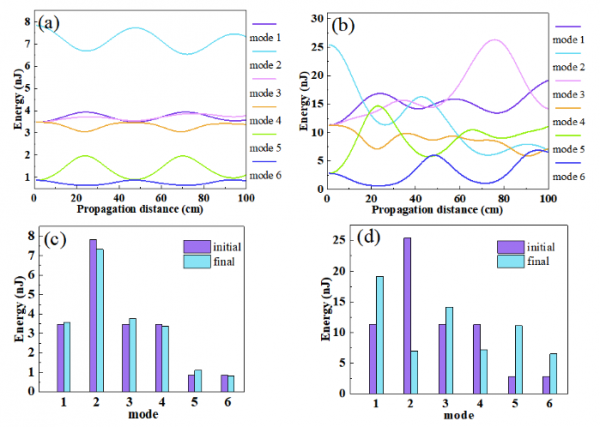 圖3 (a) (b) (c)類噪聲脈沖狀態(tài)下,激光器的輸出參數(shù)。(d)隨少模光纖長度減少,輸出功率的變化研究人員認(rèn)為,高質(zhì)量光束的形成是因為高功率脈沖在多模光纖中傳輸時,在腔內(nèi)誘導(dǎo)了克爾光束自清潔效應(yīng),并且采用數(shù)值模擬研究了這一現(xiàn)象,如圖4所示。光束自清潔促使高階模能量耦合到基模,又反過來促進(jìn)振蕩器高功率運轉(zhuǎn)時的穩(wěn)定,高功率和高光束質(zhì)量機制互通、相互支撐。