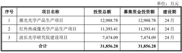 據(jù)了解,此次波長光電擬募資3.2億元,資金主要用于投資“激光光學(xué)產(chǎn)品生產(chǎn)項目”、“紅外熱成像光學(xué)產(chǎn)品生產(chǎn)項目”和“波長光學(xué)研究院建設(shè)項目”等項目。