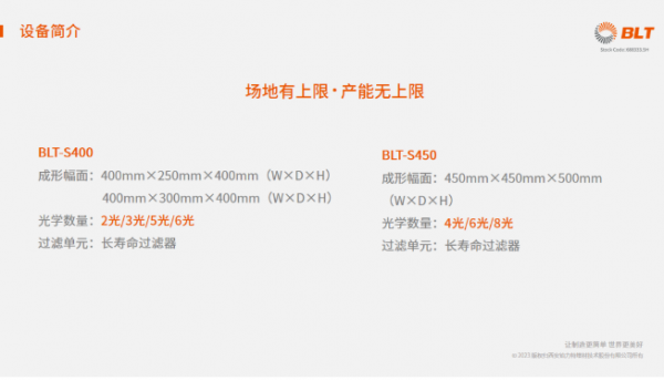 新發(fā)布的BLT-S400在原有成形尺寸上增加了400mm×300mm×400mm的新方案,同時(shí)光學(xué)數(shù)量增加至六光。BLT-S450在不改變?cè)谐尚纬叽绲幕A(chǔ)上將光學(xué)數(shù)量增加至八光。