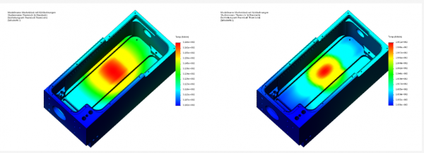 無(wú)水冷裝置振鏡溫度梯度 水冷結(jié)構(gòu)作用下振鏡溫度梯度 水冷裝置可以有效帶走熱量,確保振鏡長(zhǎng)期穩(wěn)定運(yùn)行。主要技術(shù)手段為通過冷卻水道的優(yōu)化設(shè)計(jì),獲得低紊流冷卻水流場(chǎng),設(shè)計(jì)高效外部熱交換裝置結(jié)構(gòu)等。 千瓦級(jí)高功率MOPA脈沖激光系統(tǒng)中,我們強(qiáng)烈推薦選用高質(zhì)量的石英鏡片和帶水冷系統(tǒng)的振鏡系統(tǒng)。 03、聚焦場(chǎng)鏡如何選?