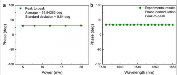 該圖顯示了使用相位解調(diào)方法的基于FPI的H-LITES傳感器的功率和波長響應(yīng)。(a) 采用相位解調(diào)方法,H-LITES信號峰峰值基本一致,平均值為55.54°,標(biāo)準(zhǔn)差為0.64°。相位解調(diào)方法不受激光源的干擾,即使使用低功率探測激光器也能產(chǎn)生出色的檢測性能。(b) 峰峰值在 1536至1555 nm波長范圍內(nèi)保持恒定。相位解調(diào)方法近似與波長無關(guān),在任何波長下具有相同的靈敏度;它不需要將波長固定在Q點,并且不受激光波長干擾。使用FPI中的相位解調(diào)方法可以克服環(huán)境干擾造成的Q點漂移。