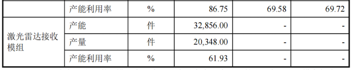值得注意的是,招股說(shuō)明書(shū)披露的激光雷達(dá)光源模組、激光雷達(dá)接收模組的產(chǎn)能利用率口徑中的產(chǎn)量與產(chǎn)銷率口徑中的產(chǎn)量存在數(shù)據(jù)“打架”情況。