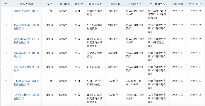 深交所方面,節(jié)前一周也共新受理了5家公司,連同此前9月22日和9月6日分別受理的廣西北部灣陸海新能源股份有限公司(下稱陸海新能)、東莞優(yōu)邦材料科技股份有限公司,深交所9月份共計新受理了7家公司。這7家公司中,陸海新能的融資計劃額16億元為最大,另一家浙江美晶新材料股份有限公司的預(yù)計融資金額15個億。