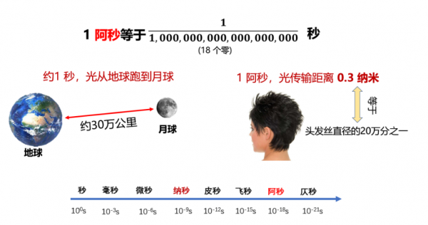 阿秒僅僅為10-18秒,如果說光從地球跑到月球的時間大約需要1秒,而在1阿秒時間內(nèi),光只能傳輸0.3納米,約為頭發(fā)絲直徑的二十萬分之一。