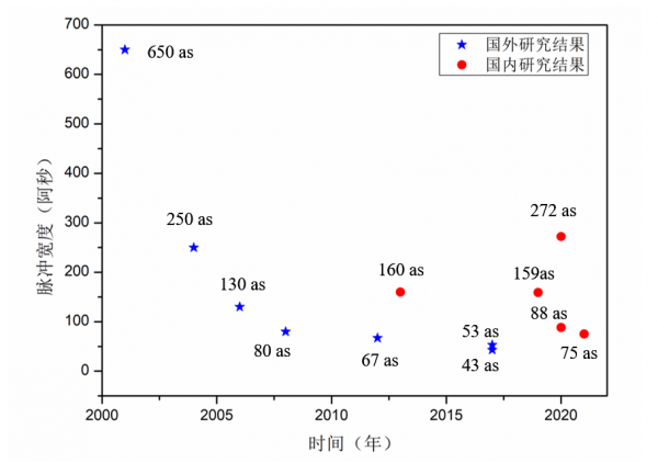 2013年,中國科學院物理研究所實現(xiàn)了160 as的孤立阿秒脈沖。此后,華中科技大學和國防科技大學在2020年相繼實現(xiàn)了272 as、88 as的孤立阿秒脈沖。