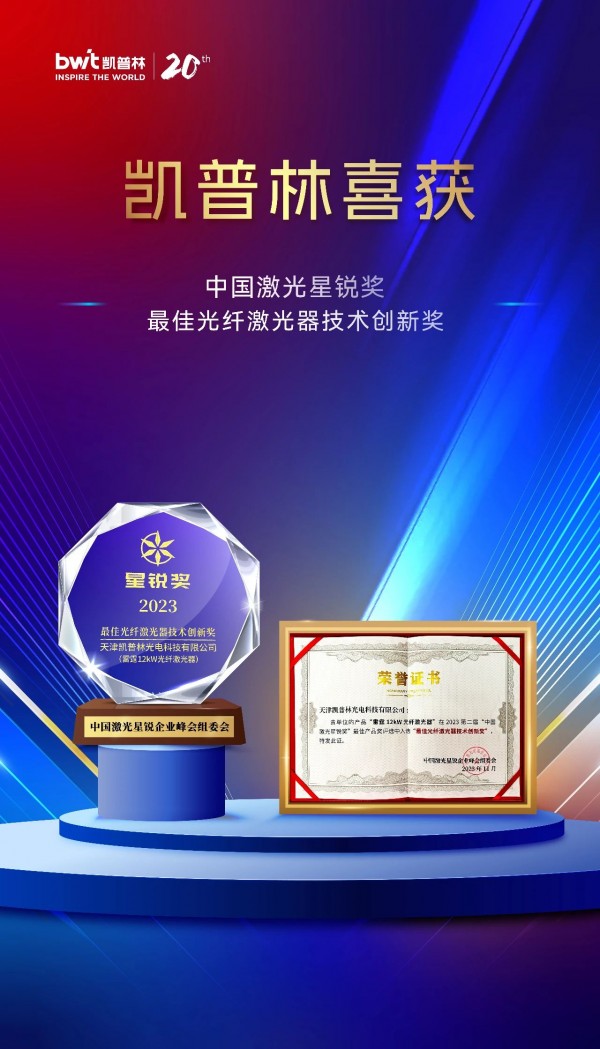 凱普林雷霆12kW光纖激光器憑借優(yōu)秀的設(shè)計(jì)理念和獨(dú)特的技術(shù)優(yōu)勢(shì),從眾多優(yōu)秀產(chǎn)品中脫穎而出,成功斬獲2023“中國(guó)激光星銳獎(jiǎng)·最佳光纖激光器技術(shù)創(chuàng)新獎(jiǎng)”。這也是凱普林繼本月獲得“光纖激光五年優(yōu)秀成果優(yōu)秀獎(jiǎng)”之后再獲榮譽(yù)。