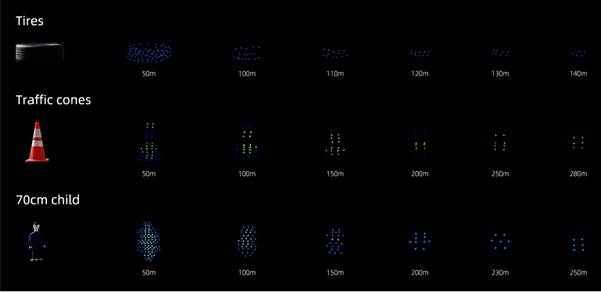 同時,M3擁有超強(qiáng)的小物體探測能力,其0.05°x0.05°的角分辨率與300m@10%的測距能力結(jié)合,可精準(zhǔn)捕捉到140米內(nèi)意外散落在地的黑色輪胎、280米內(nèi)擺放路中的交通錐桶以及250米內(nèi)闖入路中間的小孩等各類小物體,幫助智能汽車提前發(fā)現(xiàn)散落的障礙物做到及時避讓,從而助力L3自動駕駛速度上限提升至120km/h。