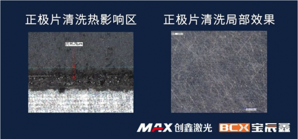 寶辰鑫激光清洗應(yīng)用解決方案具備綠色環(huán)保、潔凈度高、無耗材、成本低等優(yōu)勢(shì),清洗效果好,(清洗區(qū)域殘留物面積<1%,清洗潔凈度>99%);清洗效率高,(負(fù)極極片清洗效率0.75s,正極極片清洗效率1.4s)。電池極片經(jīng)過激光清洗后,表面無劃痕、無毛刺,動(dòng)力電池的安全性能及使用壽命得到有效保障。