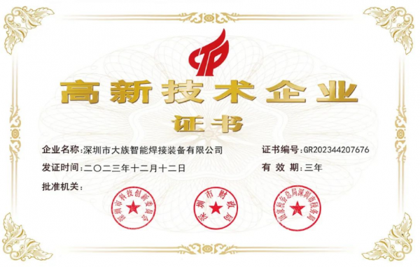 2023年12月, 全國高新技術(shù)企業(yè)認(rèn)定管理工作領(lǐng)導(dǎo)小組辦公室發(fā)布《對深圳市認(rèn)定機構(gòu)2023年認(rèn)定報備的第四批高新技術(shù)企業(yè)擬進行備案的公示》。經(jīng)過嚴(yán)格的層層評審,深圳市大族智能焊接裝備有限公司憑借自身實力,優(yōu)秀的創(chuàng)新能力, 研發(fā)投入和市場表現(xiàn), 成功入選國家高新技術(shù)企業(yè)。