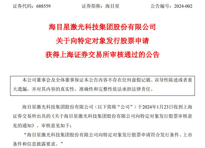 1月23日晚間,海目星激光科技集團股份有限公司(簡稱“海目星”,688559.SH)發(fā)布關于向特定對象發(fā)行股票申請獲得上海證券交易所審核通過的公告。海目星于2024年1月23日收到上海證券交易所出具的《關于海目星激光科技集團股份有限公司向特定對象發(fā)行股票審核意見的通知》。審核意見如下:“海目星激光科技集團股份有限公司向特定對象發(fā)行股票申請符合發(fā)行條件、上市條件和信息披露要求。” 中信證券股份有限公司關于海目星激光科技集團股份有限公司向特定對象發(fā)行股票之上市保薦書顯示,中信證券股份有限公司為保薦機構(主承銷商),中信證券指定彭立強、王楠楠作為本次證券發(fā)行項目的保薦代表人。 海目星激光科技集團股份有限公向特定對象發(fā)行A股股票預案(二次修訂稿)顯示,本次向特定對象發(fā)行股票募集資金總額不超過196,430.00萬元(含本數(shù)),扣除發(fā)行費用后的募集資金凈額計劃用于西部激光智能裝備制造基地項目(一期)、海目星激光智造中心項目、補充流動資金項目。 本次向特定對象發(fā)行股票的種類為境內(nèi)上市的人民幣普通股(A股),每股面值為人民幣1.00元。本次發(fā)行將全部采用向特定對象發(fā)行A股股票的方式進行,將在中國證監(jiān)會同意注冊后的有效期內(nèi)選擇適當時機向特定對象發(fā)行。 本次發(fā)行對象為不超過35名特定投資者,包括符合中國證監(jiān)會規(guī)定條件的證券投資基金管理公司、證券公司、信托公司、財務公司、資產(chǎn)管理公司、保險機構投資者、合格境外機構投資者、其他境內(nèi)法人投資者、自然人或其他合格投資者。證券投資基金管理公司、證券公司、合格境外機構投資者、人民幣合格境外機構投資者以其管理的二只以上產(chǎn)品認購的,視為一個發(fā)行對象;信托投資公司作為發(fā)行對象的,只能以自有資金認購。所有發(fā)行對象均以人民幣現(xiàn)金方式并以同一價格認購公司本次發(fā)行的股票。 本次向特定對象發(fā)行股票采取詢價發(fā)行方式,本次向特定對象發(fā)行的定價基準日為發(fā)行期首日。本次發(fā)行的發(fā)行價格不低于定價基準日前20個交易日公司股票交易均價的80%。 本次發(fā)行的股票數(shù)量按照募集資金總額除以發(fā)行價格確定,同時本次發(fā)行股票數(shù)量不超過本次向特定對象發(fā)行前公司總股本的30%,即本次發(fā)行不超過60,517,950股(含本數(shù)),最終發(fā)行數(shù)量上限以中國證監(jiān)會同意注冊的發(fā)行數(shù)量上限為準。在前述范圍內(nèi),最終發(fā)行數(shù)量由董事會根據(jù)股東大會的授權結合最終發(fā)行價格與保薦機構(主承銷商)協(xié)商確定。 本次發(fā)行完成后,發(fā)行對象認購的本次發(fā)行的股票自發(fā)行結束之日起六個月內(nèi)不得轉讓。若國家法律、法規(guī)、規(guī)章、規(guī)范性文件及證券監(jiān)管機構對本次發(fā)行股票的限售期有最新規(guī)定、監(jiān)管意見或審核要求的,公司將根據(jù)最新規(guī)定、監(jiān)管意見或審核要求等對限售期進行相應的調(diào)整。 本次向特定對象發(fā)行的股票擬在上海證券交易所科創(chuàng)板上市交易。本次向特定對象發(fā)行前的滾存未分配利潤將由本次發(fā)行完成后的新老股東共享。 本次向特定對象發(fā)行的相關決議有效期自公司股東大會審議通過本次向特定對象發(fā)行方案之日起12個月內(nèi)有效。 截至預案公告日,本次發(fā)行尚未確定發(fā)行對象,最終是否存在因關聯(lián)方認購公司本次向特定對象發(fā)行股票構成關聯(lián)交易的情形,將在發(fā)行結束后公告的發(fā)行情況報告書中披露。 截至預案公告日,公司總股本為20,172.65萬股。本次發(fā)行前后,公司均無控股股東。本次發(fā)行前,公司實際控制人為自然人趙盛宇,其直接持有海目星1.22%股份,并通過盛世??怠⒑:虾爿x一號、海合恒輝二號合計間接控制公司32.53%的股份,合計控制公司33.75%股份。本次發(fā)行完成后,假設按發(fā)行數(shù)量上限60,517,950股計算,實際控制人趙盛宇及其控制的企業(yè)合計控制發(fā)行人25.96%的股份,趙盛宇仍為公司實際控制人。本次向特定對象發(fā)行股票不會導致公司控制權發(fā)生變化,亦不會導致公司股權分布不具備上市條件。