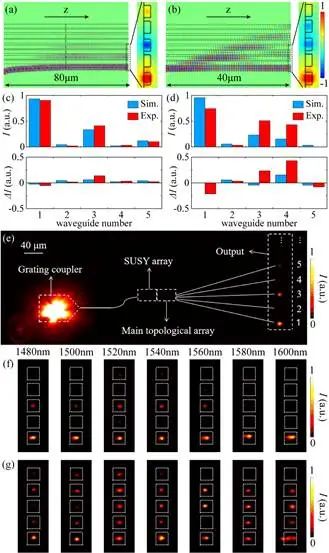 在仿真和實驗中,研究人員設(shè)計了超對稱輸入的SSH波導(dǎo)陣列和作為對照的單波導(dǎo)輸入的SSH波導(dǎo)陣列。對這兩種結(jié)構(gòu)進(jìn)行全波仿真,超對稱輸入結(jié)構(gòu)激發(fā)出了準(zhǔn)確的模式,保持了良好的局域性,而單波導(dǎo)輸入陣列輸出的振幅和相位都發(fā)生了錯亂(圖3(a,b))。在實驗中,將1550 nm波長的激光耦合輸入到界面附近的波導(dǎo),并將輸出端的信號引出(圖3(e))。測量得到超對稱輸入陣列的輸出與仿真和理論計算結(jié)果基本吻合,而單波導(dǎo)輸入陣列的輸出的局域性顯著變差(圖3(c,d))。此外,超對稱輸入陣列具有較好的寬帶性,而單波導(dǎo)輸入陣列的輸出隨波長增大,其局域性變差(圖3(f,g))。