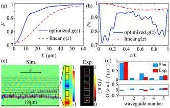 前文中的絕熱設(shè)計需要緩慢調(diào)制以滿足絕熱條件,從而不可避免地導(dǎo)致較大的器件尺寸(~40 μm)。因此,希望能夠在保持泵浦效率不變的同時,使器件更為緊湊。研究人員采取逆向設(shè)計的方法,通過打破絕熱條件,使得零模能夠暫時演化為其他模式,以加速泵浦過程,但最后仍然能回到零能級(圖4(b))。通過逆向設(shè)計優(yōu)化,達(dá)到相同泵浦效率所需的波導(dǎo)尺寸顯著縮短(~18 μm,見圖4(a))。逆向設(shè)計的輸出與光強(qiáng)分布如圖4(c,d)所示,可以看出,所得到的拓?fù)鋺B(tài)仍具有較高的保真度。