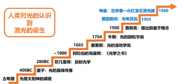 從古希臘時期到公元1000年左右,人們對于光的認(rèn)知還處于定性的階段。1021年,伊本·海塞姆出版的《光學(xué)之書》,提出光學(xué)理論并使用實(shí)驗(yàn)進(jìn)行驗(yàn)證,開啟了現(xiàn)代光學(xué)的序幕。經(jīng)過漫長的中世紀(jì),西方的物理學(xué)家們相繼提出光的波動學(xué)說和微粒學(xué)說來解釋光的各種物理現(xiàn)象。直到被稱為“物理奇跡年”的1905年,天才物理學(xué)家愛因斯坦先后發(fā)表了五篇具有劃時代意義的論文,其中一篇《關(guān)于光的產(chǎn)生和轉(zhuǎn)變的一個啟發(fā)性觀點(diǎn)》首次提出了光子的概念,發(fā)現(xiàn)了光電效應(yīng),并獲得了諾貝爾物理學(xué)獎,為激光的發(fā)明奠定了理論基礎(chǔ)。