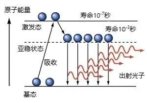 激光(英文名:laser)是“Light Amplification by Stimulated Emission of Radiation”的縮寫,意為光的受激輻射放大。光是由光子產(chǎn)生的,光子是組成物質(zhì)的基本粒子之一,光子非常小,靜止時沒有質(zhì)量。根據(jù)量子力學(xué)的原理,一個原子體系中,電子基本上是分層運(yùn)動的。當(dāng)光子射入時,原子核會吸入光子,而電子則因?yàn)楂@得了能量,從勢能較低的內(nèi)層遷移到勢能較高的外層(受激吸收過程)。當(dāng)電子從勢能較高的外層跌入勢能較低的內(nèi)層時,相應(yīng)的原子核會釋放出光子,從而產(chǎn)生光。跌落的層數(shù)越多,光子的能量越大(受激發(fā)射過程)。