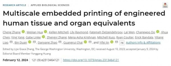 近日,大連理工大學(xué)機械工程學(xué)院趙丹陽教授課題組和美國內(nèi)華達(dá)大學(xué)雷諾分校機械工程系Yifei Jin課題組等團隊合作,針對多尺度復(fù)雜組織/器官體外精準(zhǔn)制造這一長期困擾生物打印領(lǐng)域的難題,提出了多尺度浸入式打印策略(Multiscale Embedded Printing,MSEP),實現(xiàn)了多尺度人體組織和器官的體外制造,從而有效驗證了MSEP技術(shù)在構(gòu)建復(fù)雜人體組織和器官方面的巨大潛力。該研究成果以“工程人體組織和器官等效物的多尺度浸入式打印”(Multiscale embedded printing of engineered human tissue and organ equivalents)為題發(fā)表于美國國家科學(xué)院官方學(xué)術(shù)期刊《美國國家科學(xué)院院刊》(Proceedings of the National Academy of Sciences ,PNAS)。