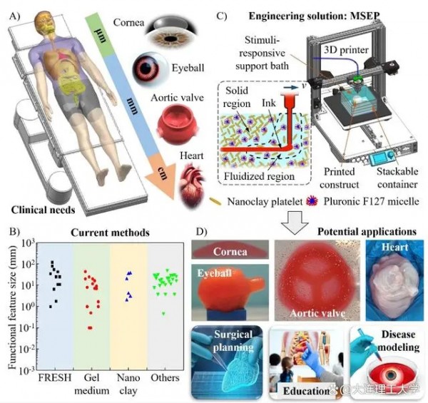 MSEP技術(shù)采用刺激響應(yīng)型屈服應(yīng)力流體作為支撐浴,該支撐浴由溫敏性水凝膠Pluronic F127和屈服應(yīng)力添加劑納米粘土組成,同時具有溫敏性和屈服應(yīng)力特性,可在打印過程中快速添加并在室溫下提供穩(wěn)定支撐?;贛SEP技術(shù),本研究提出了一種動態(tài)層高控制策略,實現(xiàn)了具有微米級表面粗糙度的工程角膜結(jié)構(gòu)的3D打印。同時,利用MSEP技術(shù)制造了具有毫米級特征尺寸的異質(zhì)人類眼球和主動脈瓣模型,以及具有分米級尺度的全尺寸人體心臟模型。該研究成果為多尺度人體組織和器官的精準(zhǔn)制造提供了新的方法和可能性,為未來的組織工程研究和人造器官移植奠定了重要的技術(shù)基礎(chǔ)。