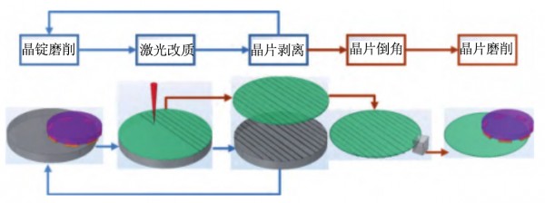 激光剝離技術(shù)可將晶錠加工成晶片,是多線切 割的替代技術(shù)。如圖4所示,用于量產(chǎn)的激光剝離 技術(shù)應(yīng)包含激光改質(zhì)、晶體剝離、晶錠加工三個(gè)工 藝步驟。首先在晶錠內(nèi)部指定深度使用激光掃描形 成一個(gè)完整的改質(zhì)面,降低晶體結(jié)合力;而后利用 機(jī)械拉伸、機(jī)械扭轉(zhuǎn)、超聲振動(dòng)、冷卻的方式,使 晶體在改質(zhì)面處斷裂,分割為晶錠與晶片;由于剝 離后的晶錠表面粗糙度較大,對(duì)激光的散射效應(yīng)較 強(qiáng),因此在下一層激光改質(zhì)前需將晶錠表面加工至較光滑的狀態(tài)。上述三個(gè)步驟依次循環(huán),即可將晶 錠連續(xù)加工成晶片。半導(dǎo)體器件制造工藝需在原子 級(jí)平滑的表面上進(jìn)行外延薄膜生長(zhǎng),利用激光剝離 技術(shù)加工的晶片表面粗糙度僅可達(dá)到微米級(jí),因此 需進(jìn)一步通過磨拋加工,方可制成合格襯底片。