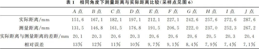 從表 1 可見,10 個樣點的測量結果每次測量值與實際值的差距均略大于 20mm,本實驗所購激光雷達的最佳測量范圍為 5~12m,受繪制坐標紙張面積所限,所選取的采樣點距離均小于 5m,不在激光雷達最佳測量范圍之內,應該是導致測量誤差較大的主要原因,從測量結果也可以發(fā)現(xiàn)隨著測距的增加(A 點到 J 點),相對誤差越來越小,如果待測點在 5~12m,估計實際距離與測量距離的差距和相對誤差應該更小,測量效果會更好。