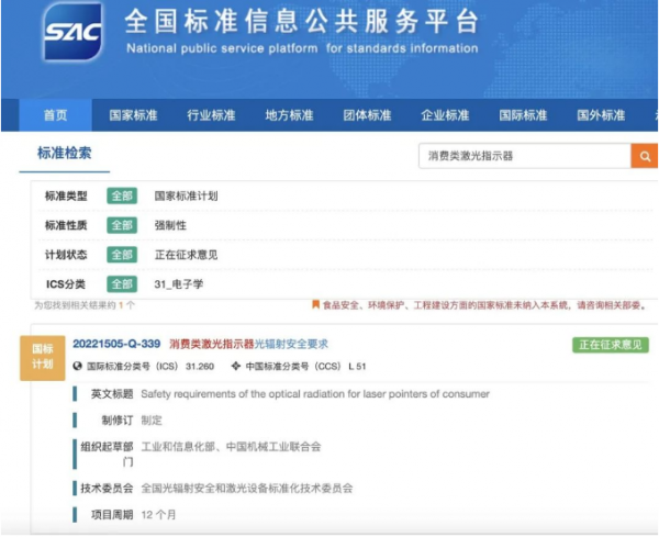 強制性國家標(biāo)準(zhǔn)計劃《消費類激光指示器產(chǎn)品光輻射安全要求》由工業(yè)和信息化部提出,委托全國光輻射安全和激光設(shè)備標(biāo)準(zhǔn)化技術(shù)委員會(TC284)起草。擬實施日期:發(fā)布后6個月正式實施。