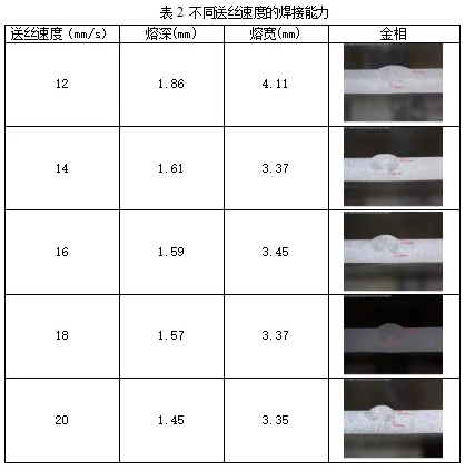 手持焊激光焊接一般采用的是激光填絲焊,會(huì)配置送絲機(jī)作為激光送絲設(shè)備,而送絲機(jī)的送絲速度也會(huì)影響到設(shè)備的焊接能力。如下表2所示,為功率1000W,焊接頭擺幅3mm,頻率50Hz參數(shù)時(shí),不同送絲速度下在鋁合金上的焊接情況??梢园l(fā)現(xiàn),在其他參數(shù)不變的情況下,送絲速度越快,熔深越淺,焊接能力越差。
