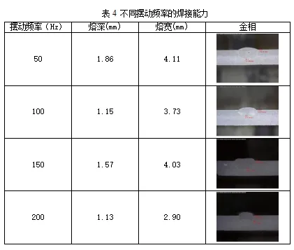 在搭載銳科焊將系列RFL-C015H1手持焊專用激光器的激光設(shè)備上焊接鋁合金,分別控制單變量為擺幅和擺動(dòng)頻率,觀察焊接后的熔深和熔寬,分別如下表3、4所示??梢园l(fā)現(xiàn),隨著擺幅的增加,焊縫表面的寬度明顯變大,但當(dāng)擺幅為4、5mm時(shí),焊接頭的擺動(dòng)速度會(huì)達(dá)不到要求,焊縫表面形貌表面不連續(xù);隨著頻率的增加,焊接熔深變低,但當(dāng)頻率超過100Hz時(shí),表面形貌也變成不連續(xù)。