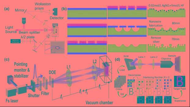 折射器件如紅外微透鏡在紅外成像、光束整形等方面具有重要應(yīng)用。科研人員通過飛秒激光輔助濕法刻蝕技術(shù),成功制備了硅基微透鏡陣列,實現(xiàn)了超大規(guī)模微透鏡的制備,適用于激光的光束勻化器等領(lǐng)域。同時,飛秒激光輔助干法刻蝕技術(shù)也被引入,成功制備了硅、碳化硅、砷化鎵以及金剛石等硬脆材料的微透鏡陣列,展現(xiàn)了在硬脆材料高精密微加工領(lǐng)域的廣泛應(yīng)用前景[圖2(a)]。